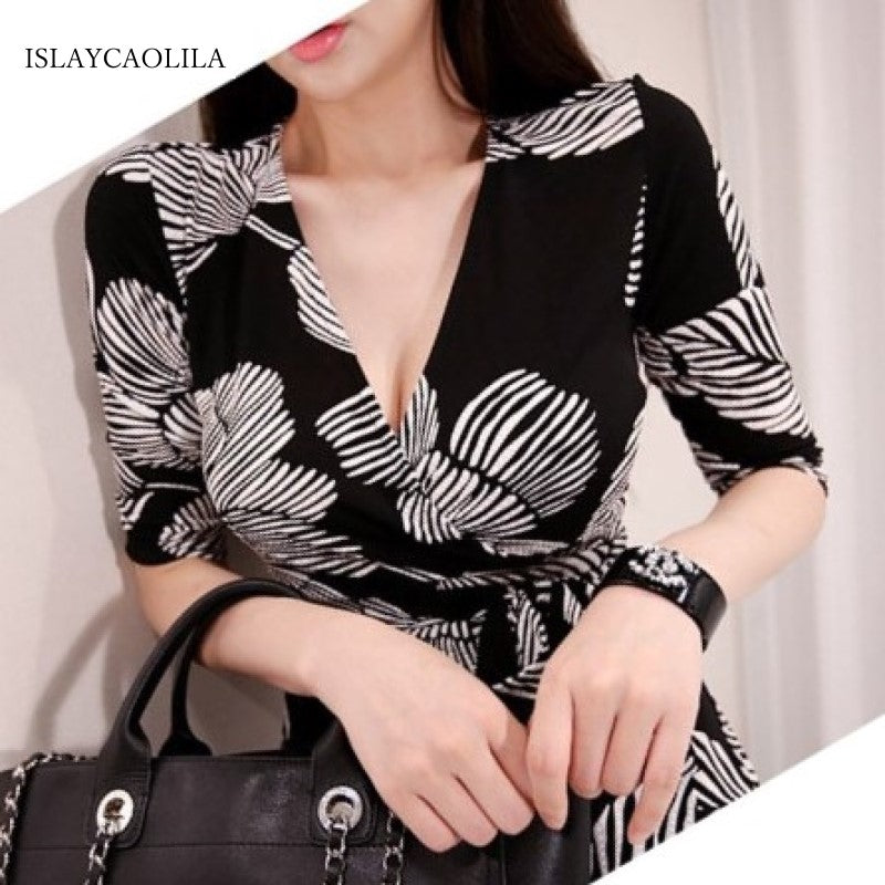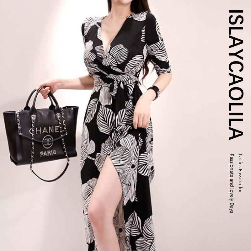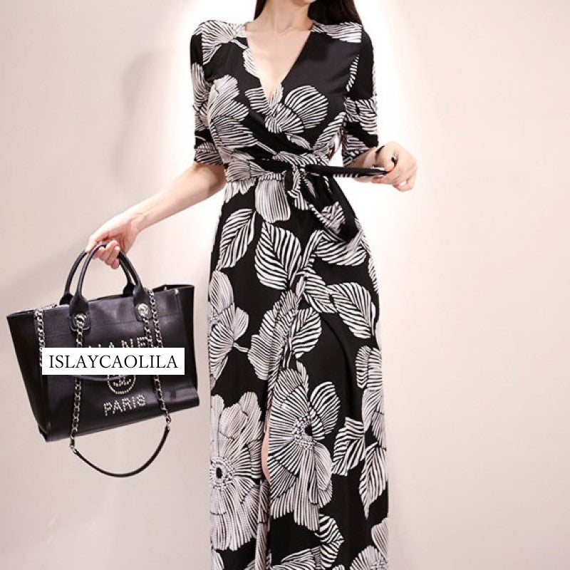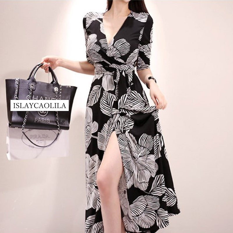 大きな花柄のモダンアートを身に巻き付けるような、スタイリッシュなデザインです。カシュクールでVカットにまとめられた胸元がチャームポイント、フェミニンさを演出してくれます。