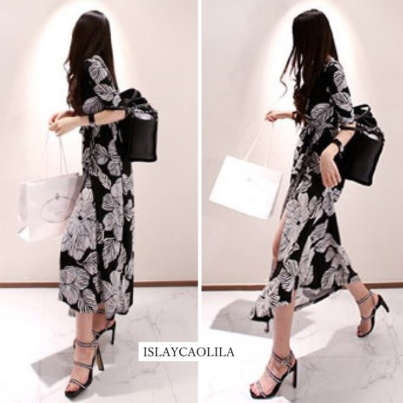 ハイウエストデザインなので、着痩せと脚長効果を発揮し、綺麗で大人なシルエットを演出します。ロングスカートからの深いスリットがセクシーにレッグを魅せます。