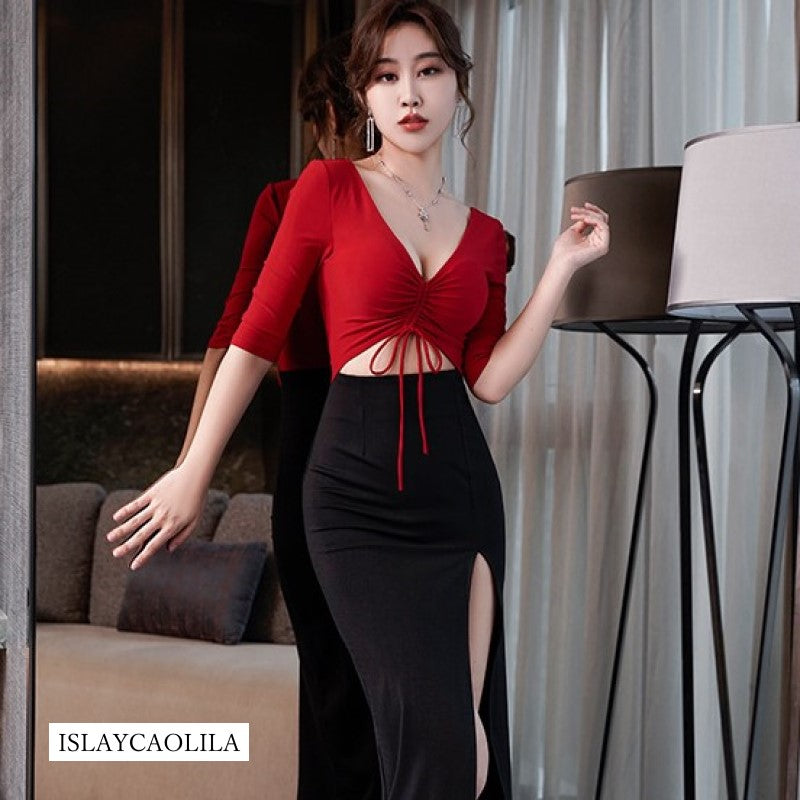 ミニ丈トップスとスリットが長く入ったロングスカートの組み合わせがセクシーなタイトワンピース、ドレスです。