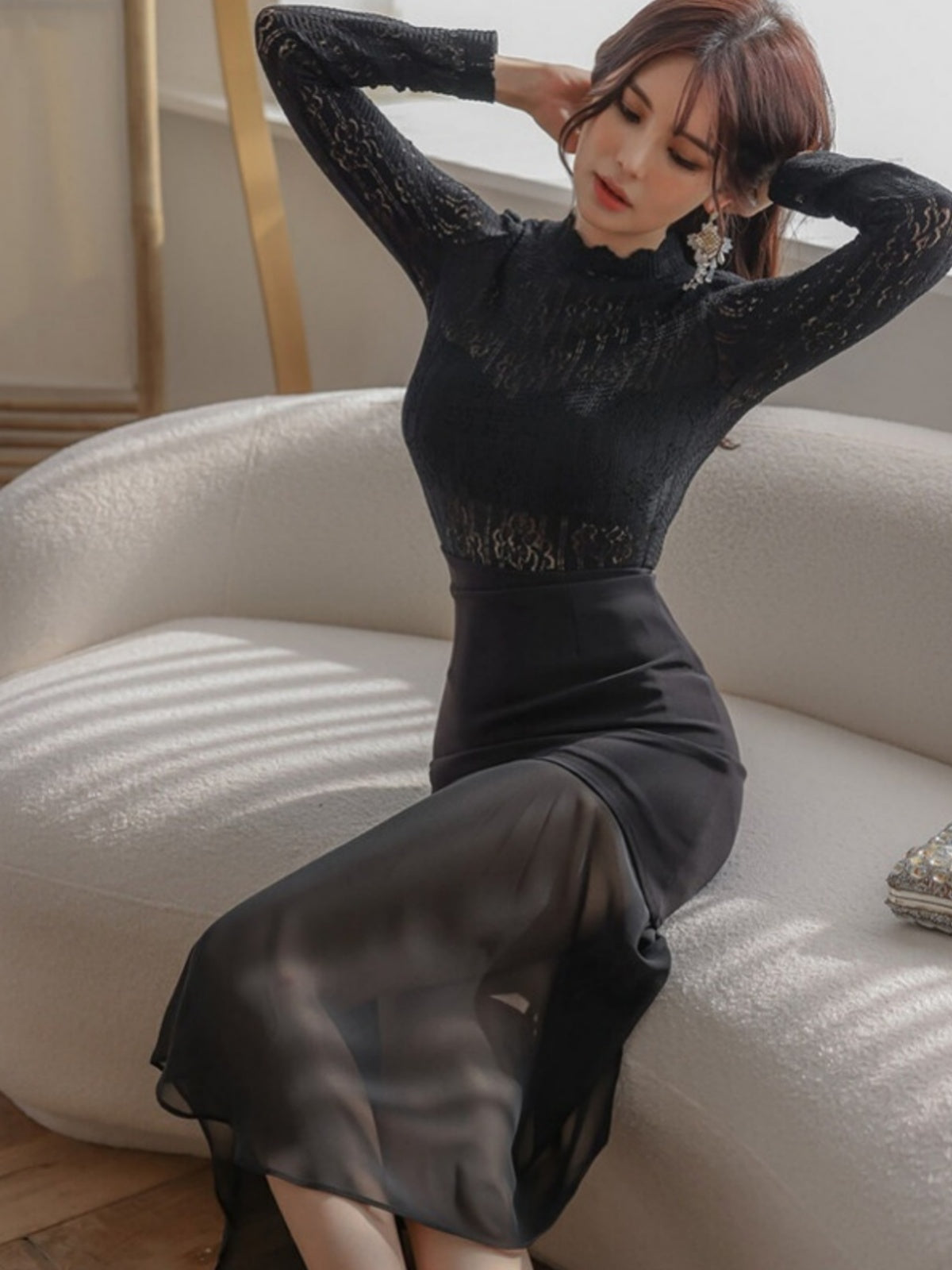 トップスはレース模様がゴージャスに輝く。首元のスタイルもこだわりがたっぷり。