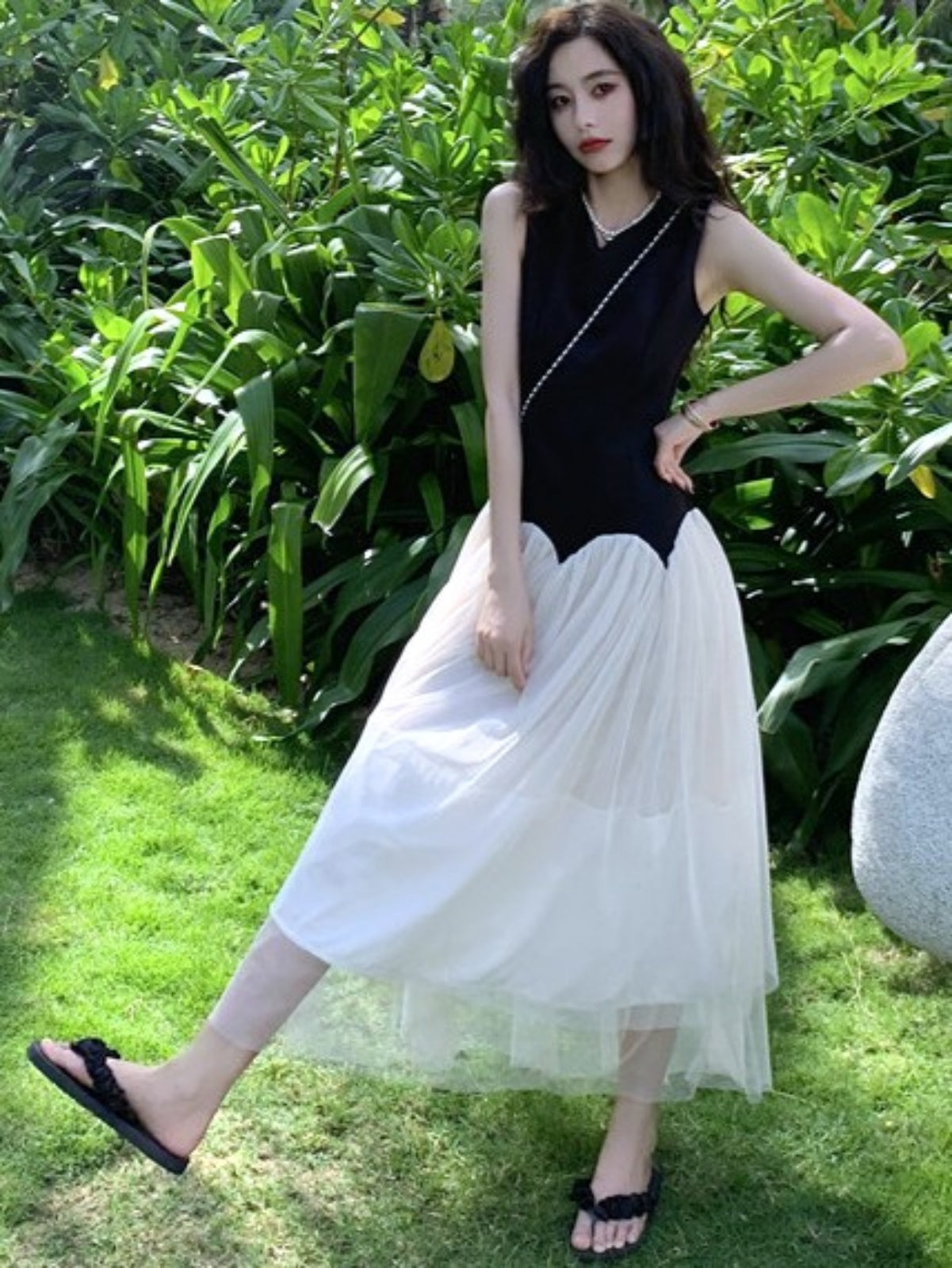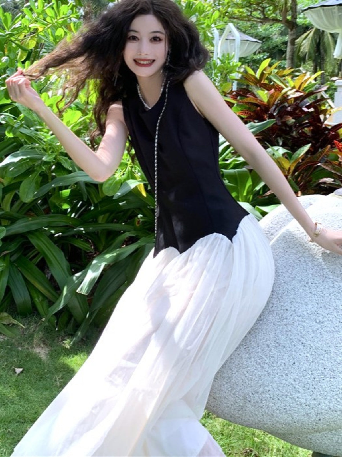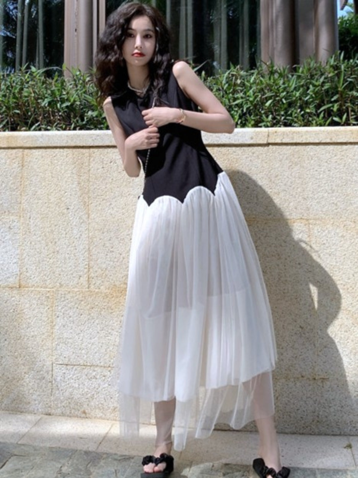 ブラック×ホワイトの組み合わせが上品で大人っぽく、ウエスト切替デザインがアクセントです。