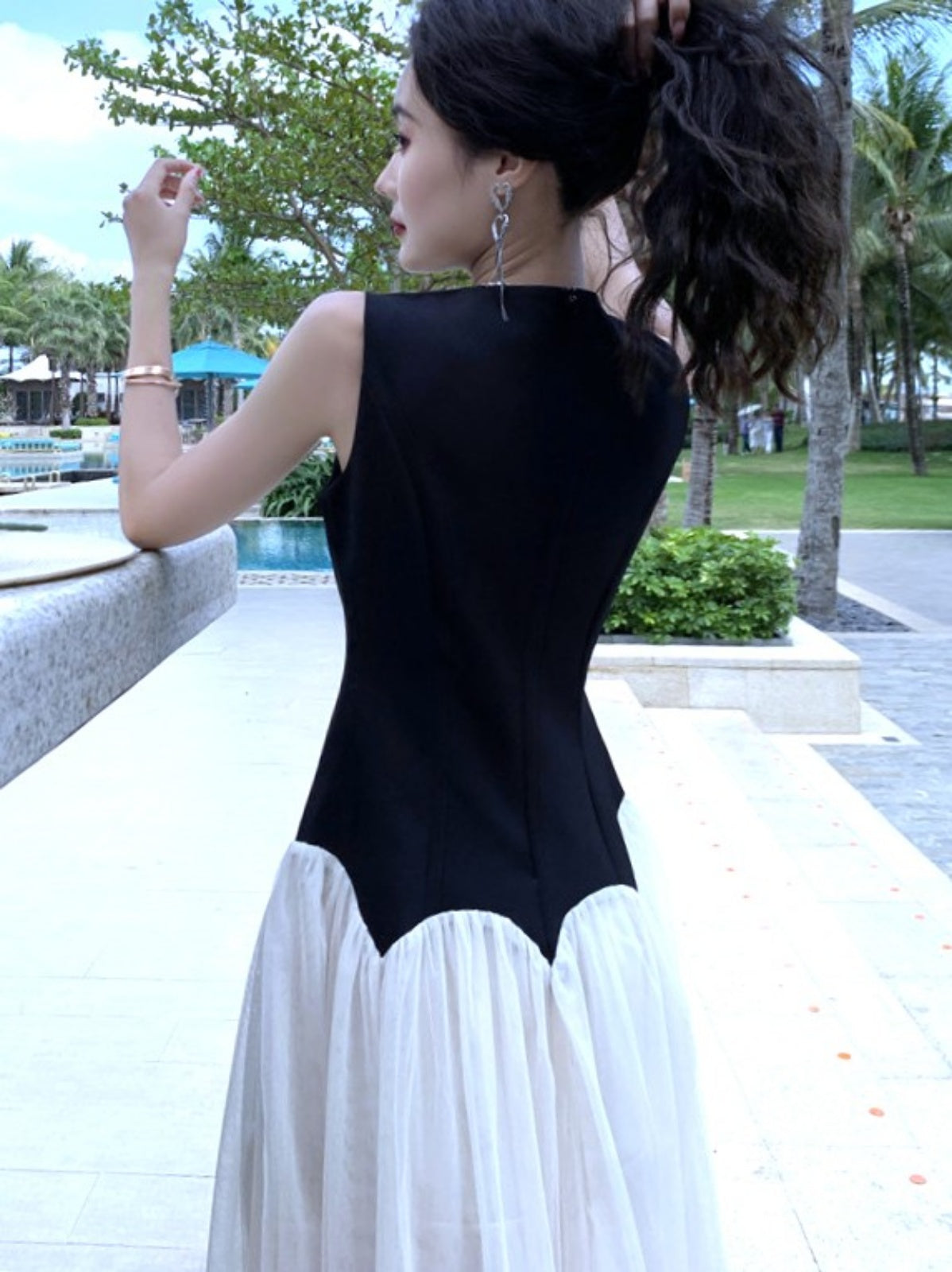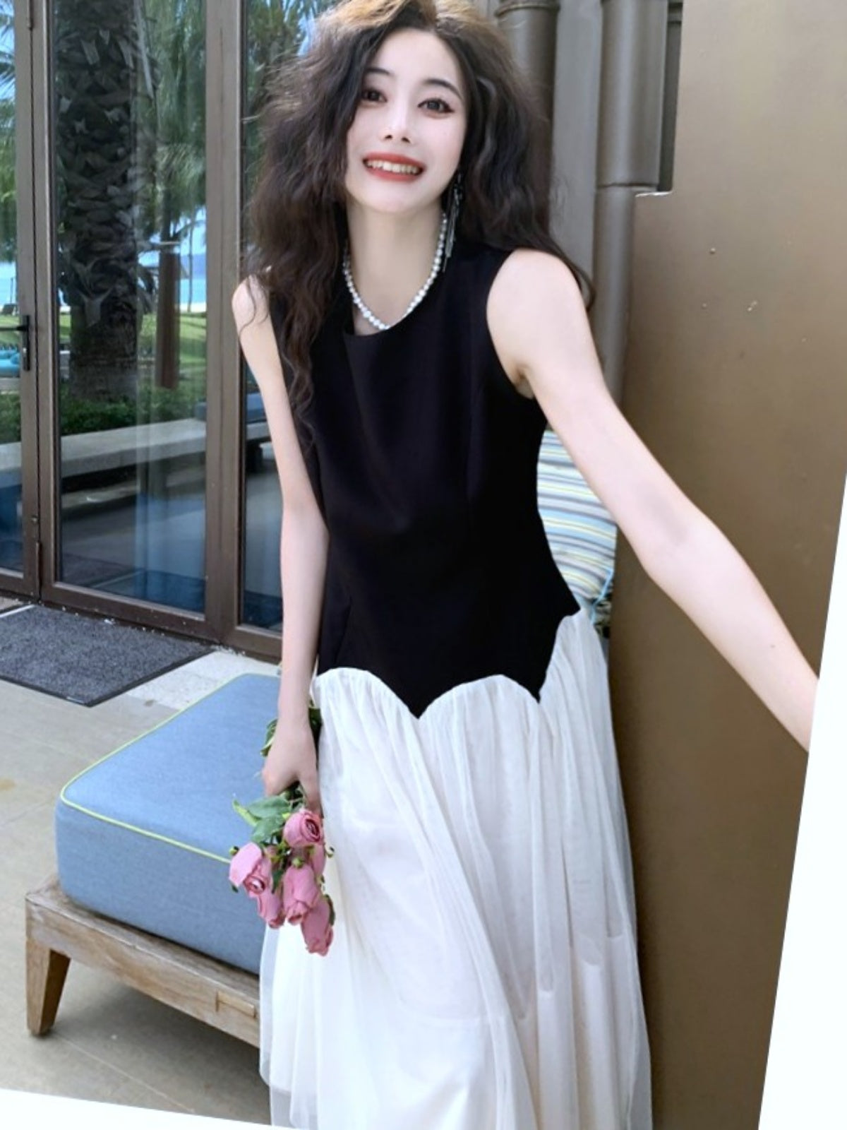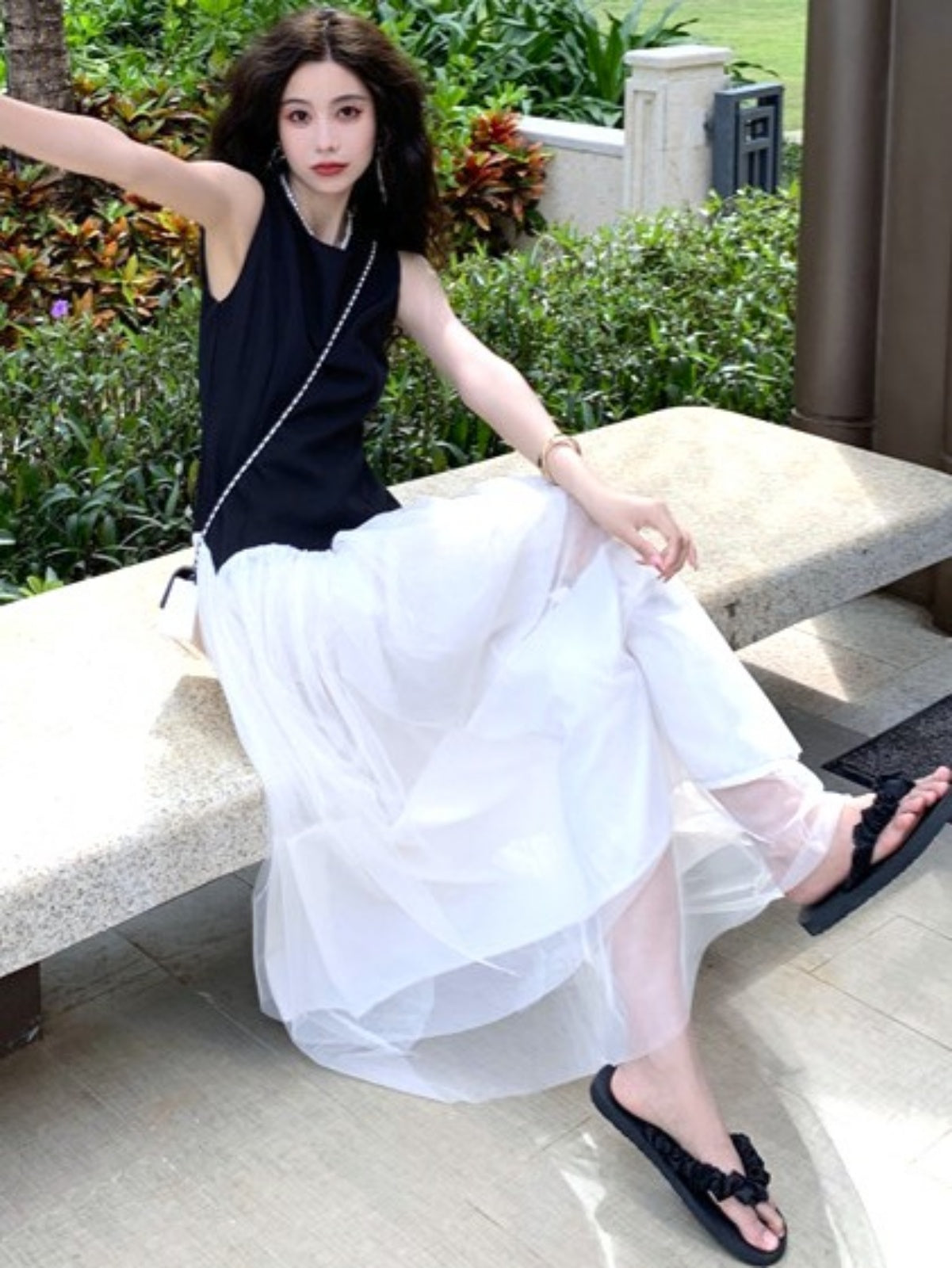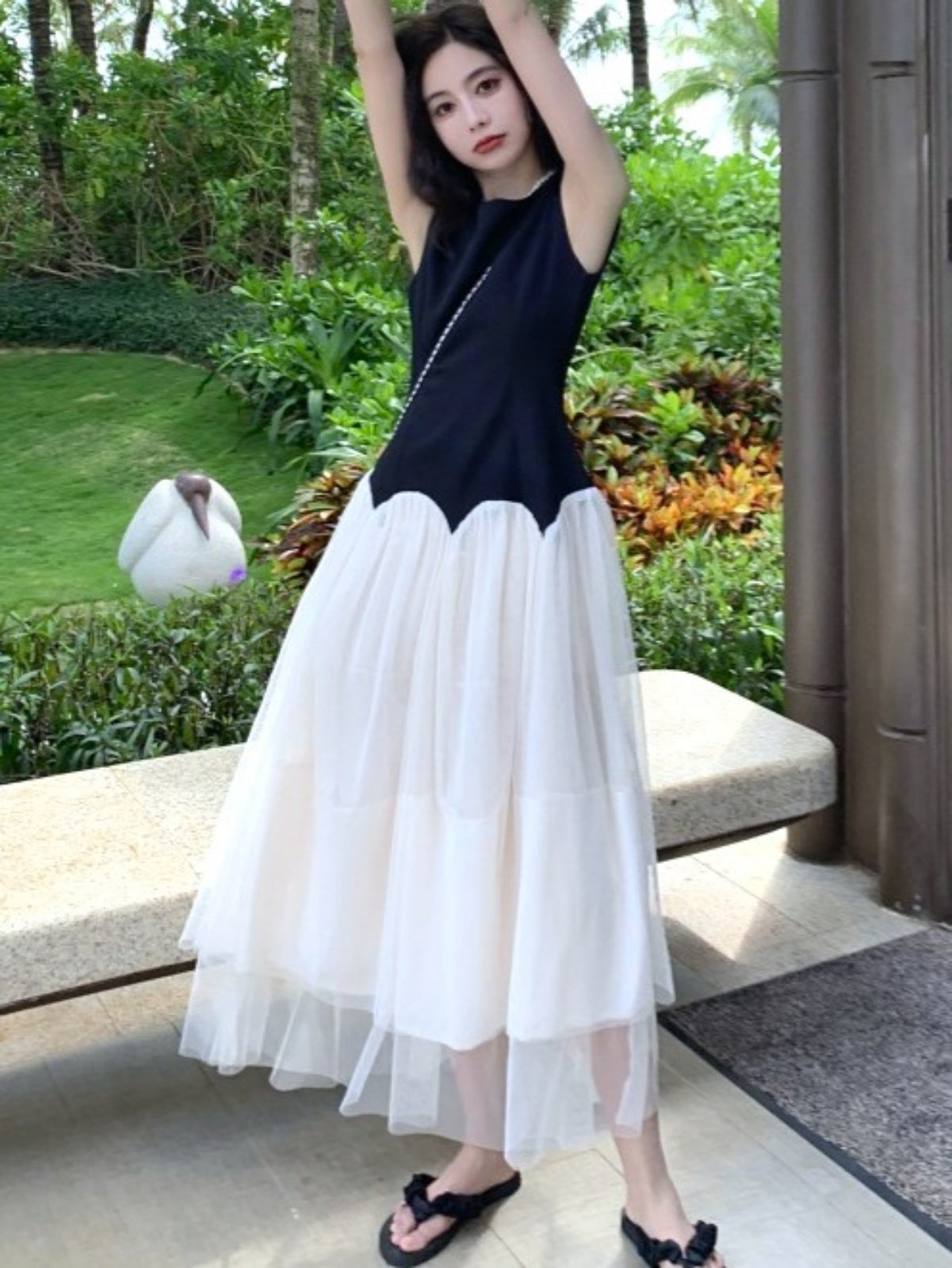 ブラック×ホワイトの組み合わせが上品で大人っぽく、ウエスト切替デザインがアクセントです。