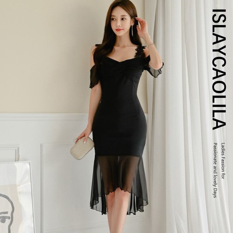 ハイウエストからのタイトなスカートがボディラインをすっきりと表現します。 タイトミニのスカートに、シースルーのフィッシュテールが重なり、エレガントなセクシーさを感じます。