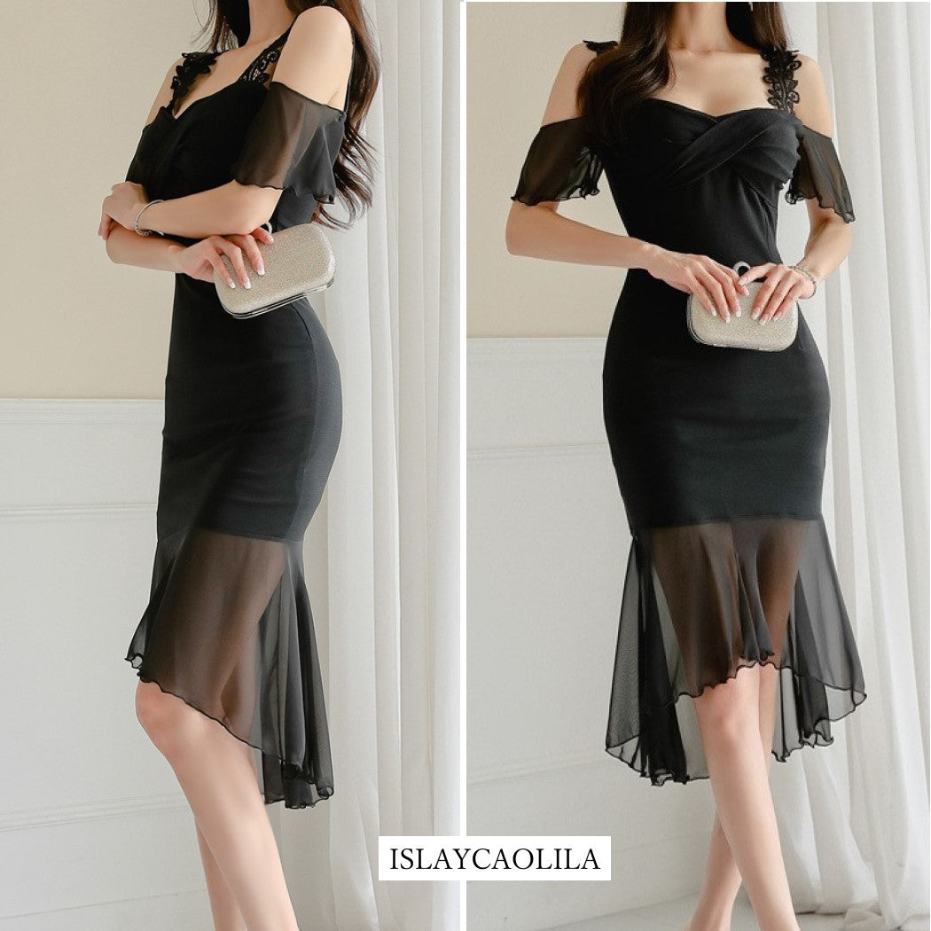 軽やかなシースルーのフィッシュテールが、フェミニンにエレガントに香るワンピース、パーティドレスです。