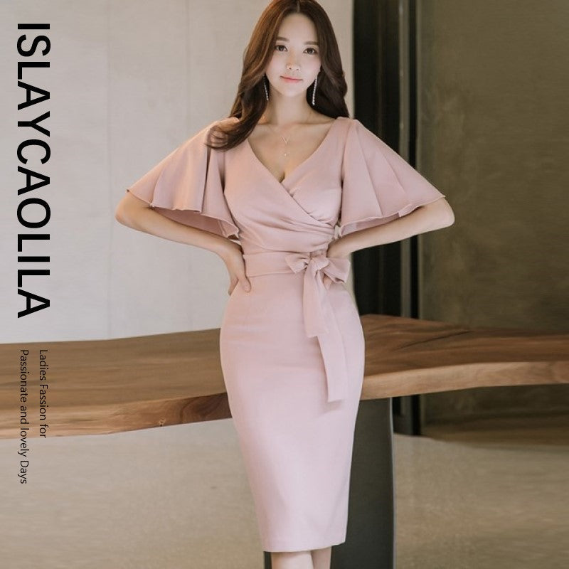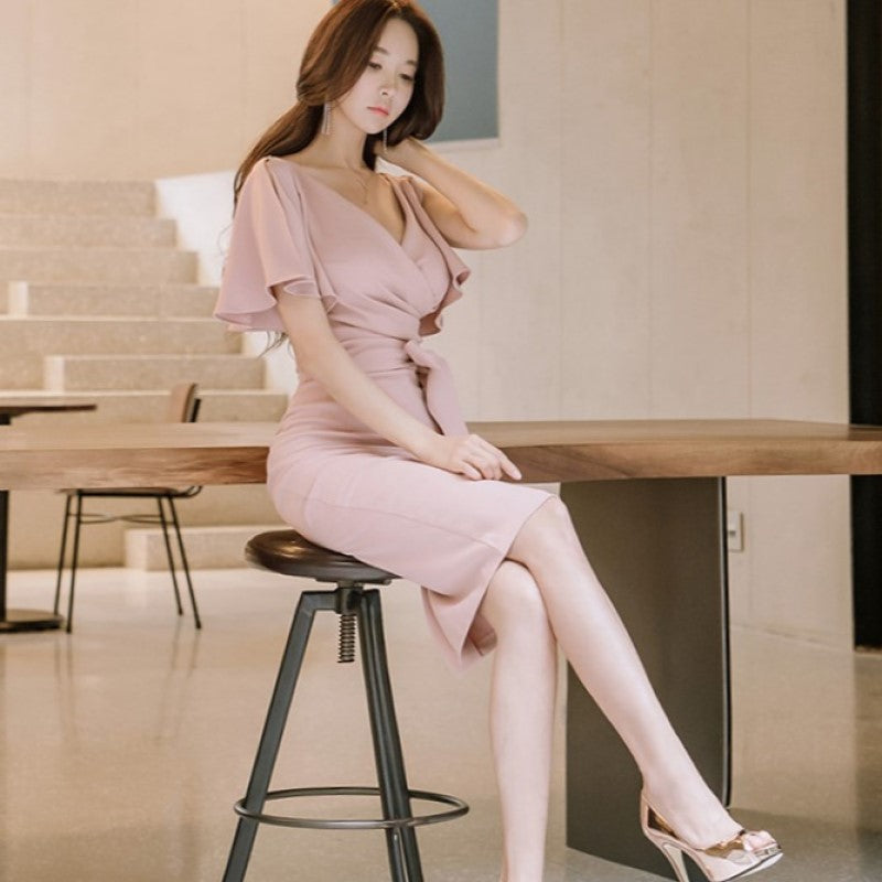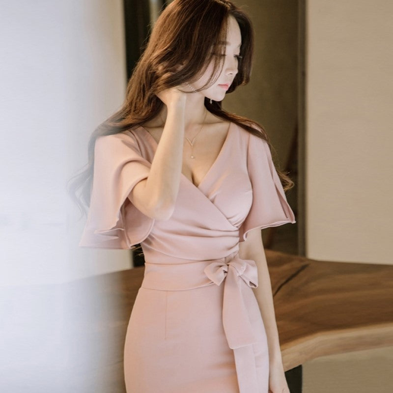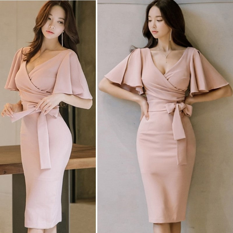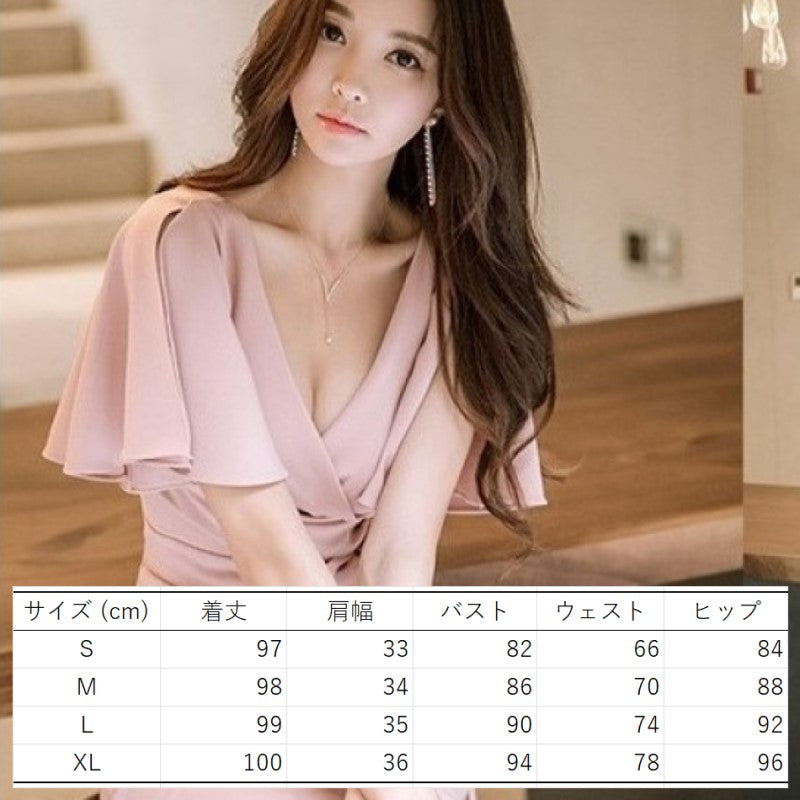 ・静かに輝くペールピンクが、女性としての優しい雰囲気を表します。Vカットでカシュクールな胸元が、フェミニンにほんのりとセクシーさを加えます。