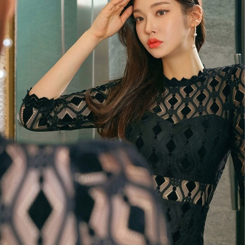 幾何学模様のブラックのシースルー素材が素肌に映える高級感たっぷりな一着。全身黒でもシアーな透け感で重たく見えません。