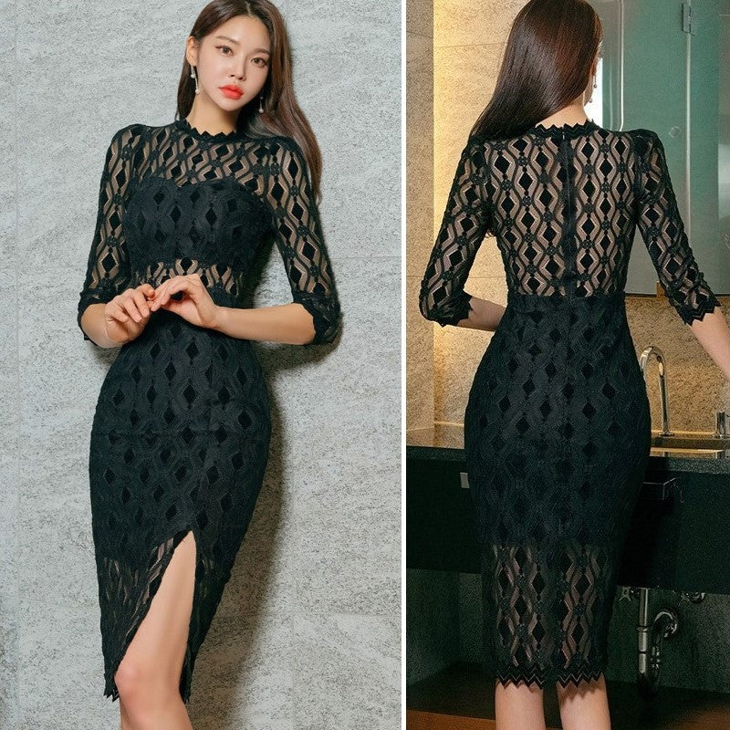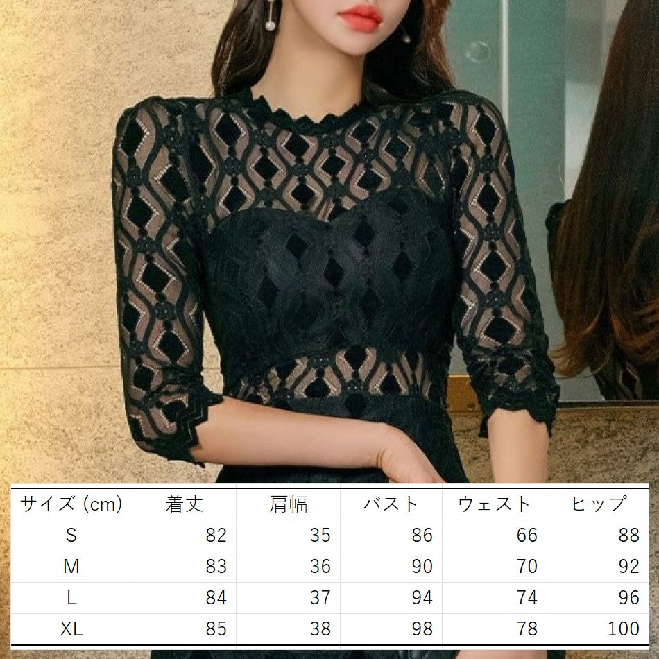 詰まった襟もとや七分袖が上品で高級感あふれるワンピース。大胆なシースルーがセクシーかつスタイリッシュな一着です。