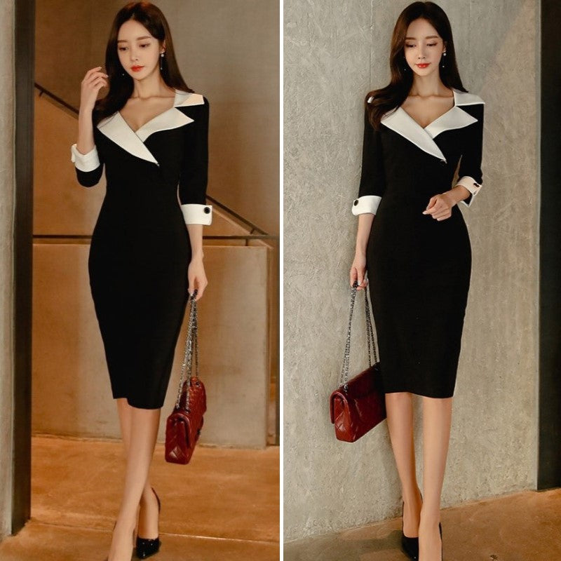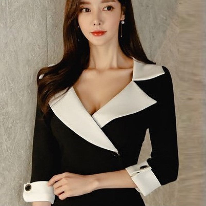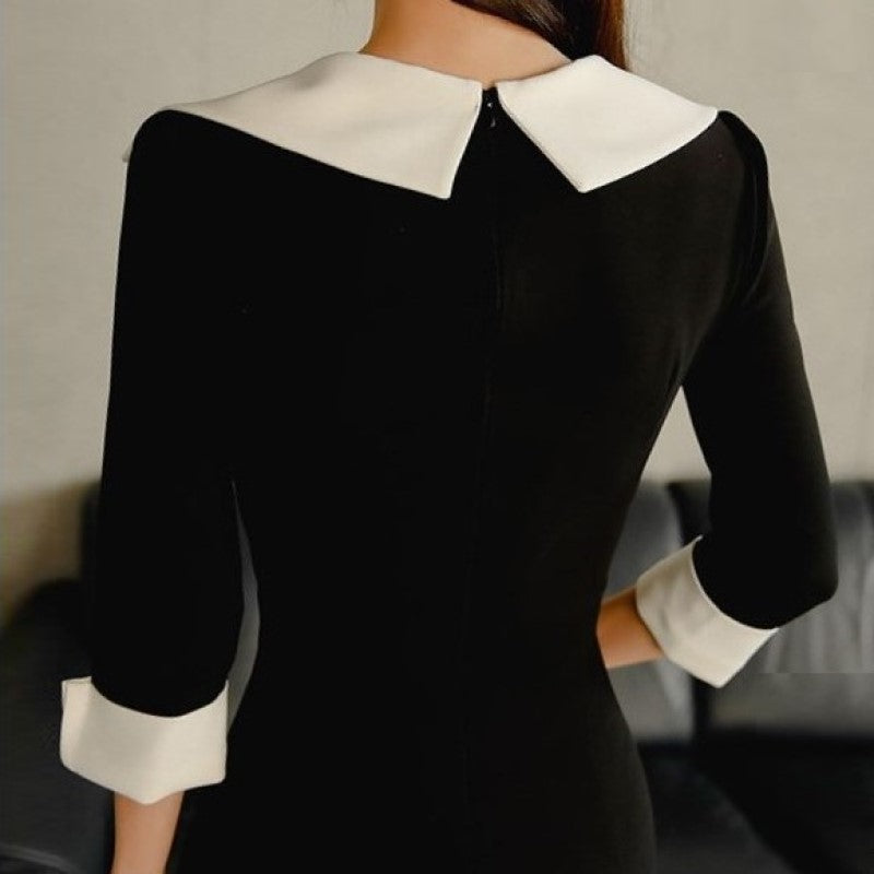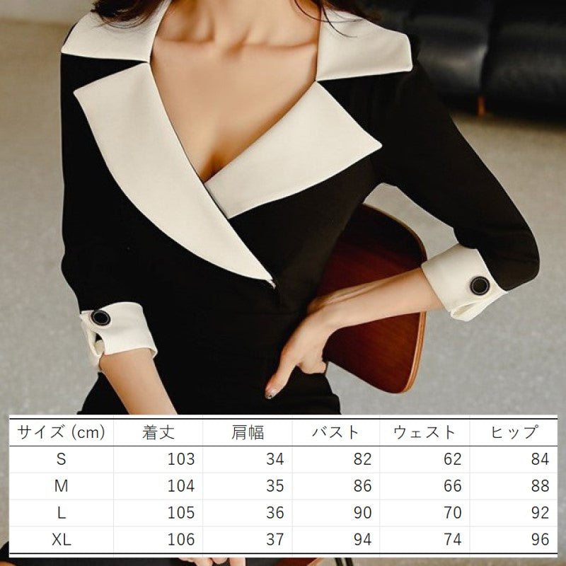 清潔感あふれるジャケット風のカラーで気分はファーストレディ。モノトーンがエレガントでスタイリッシュなワンピ―ス、パーティドレスです。