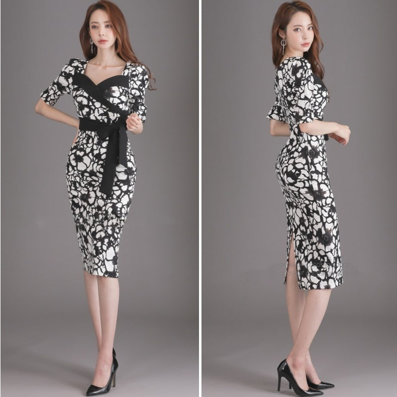 ウエストの可愛いブラックリボンでスタイルアップが叶う。タイトなデザインで体のラインを美しく見せつつも、スリットが入っているため動きやすいです。