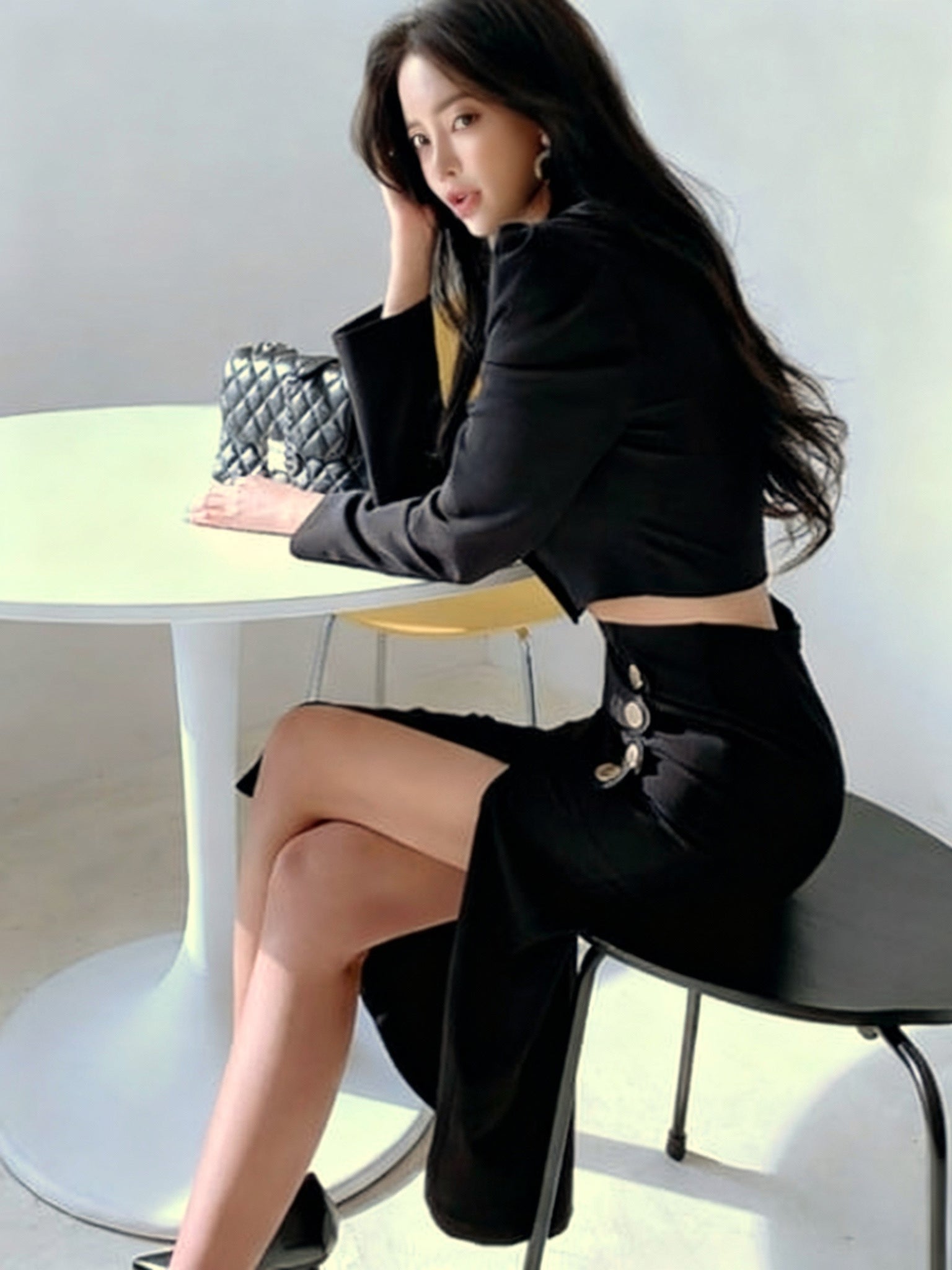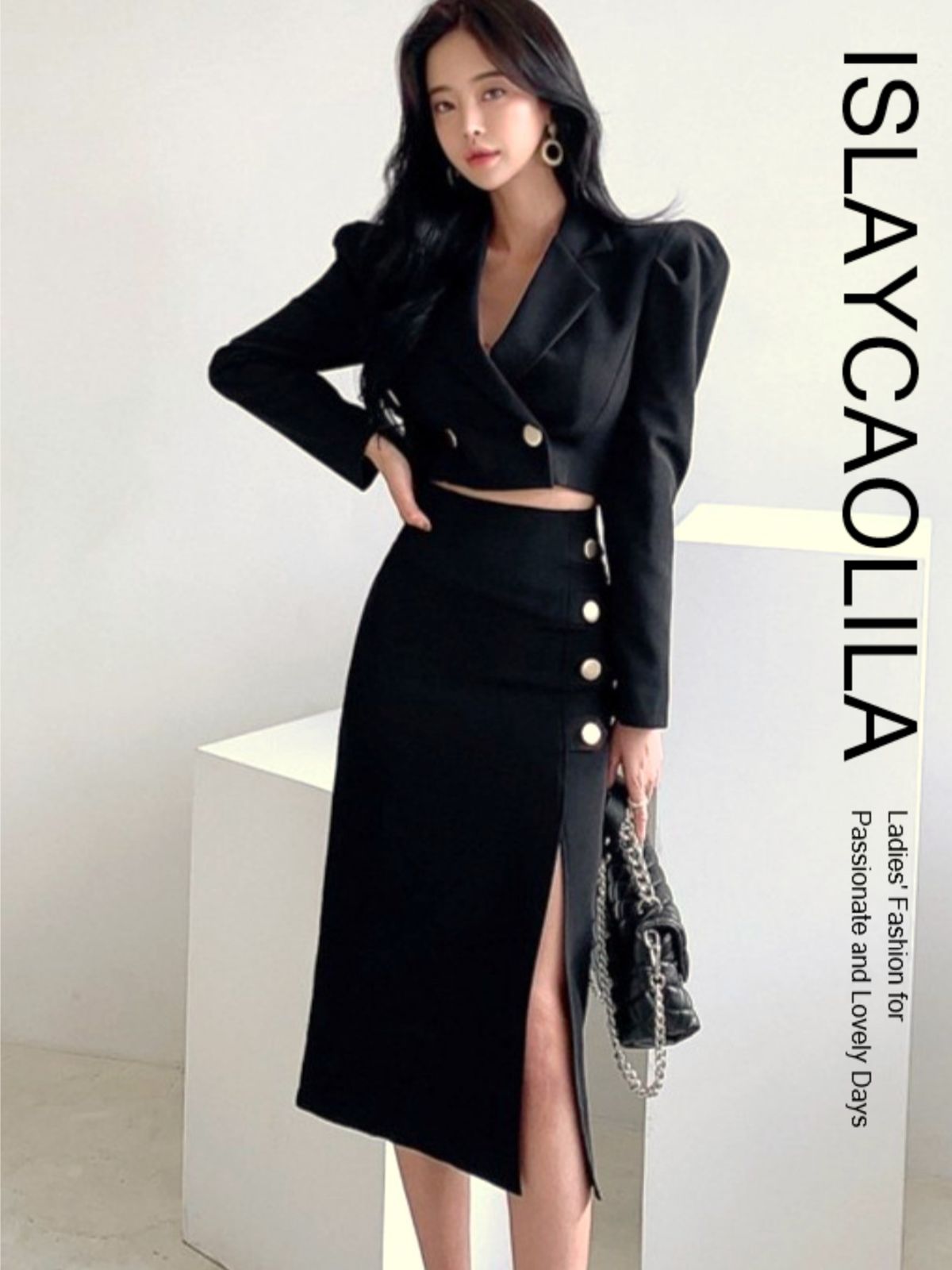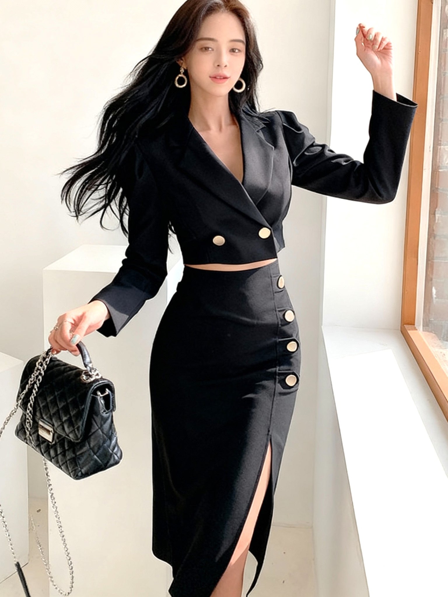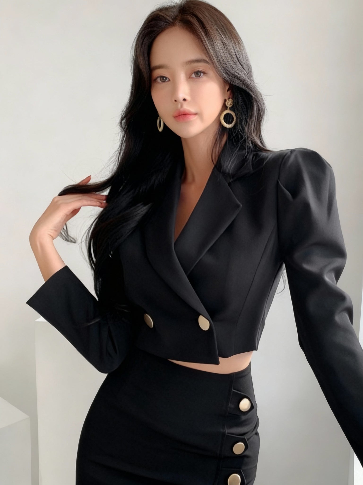 モード感漂うショート丈ジャケットとハイウエストスカートのセットアップ。 無駄を削ぎ落としたシルエットに、ゴールドボタンのアクセントが映える構築的なデザインです。