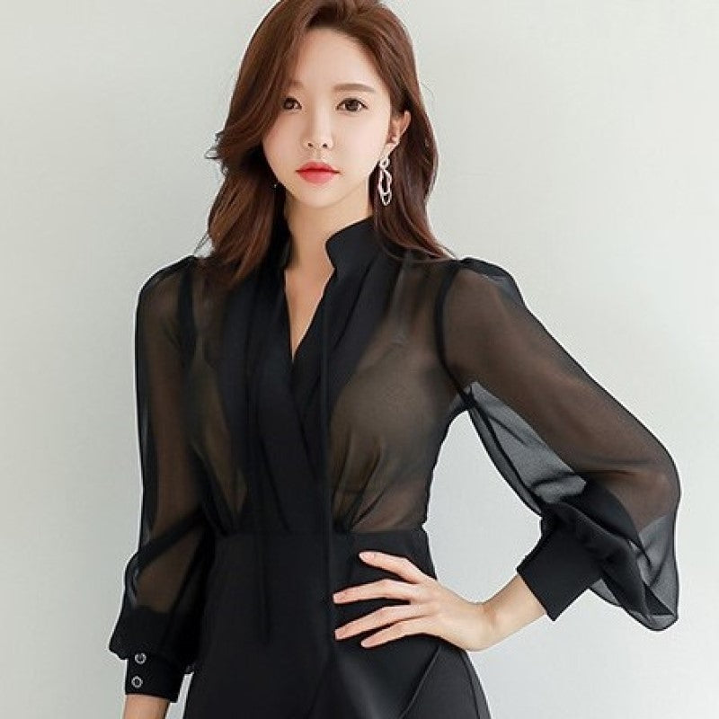 ・ふんわりとした袖のバルーンスリーブがガーリーさをプラスしてくれます。トップは全体がシアーになっていて着こなしによってはセクシーな印象を与えます。