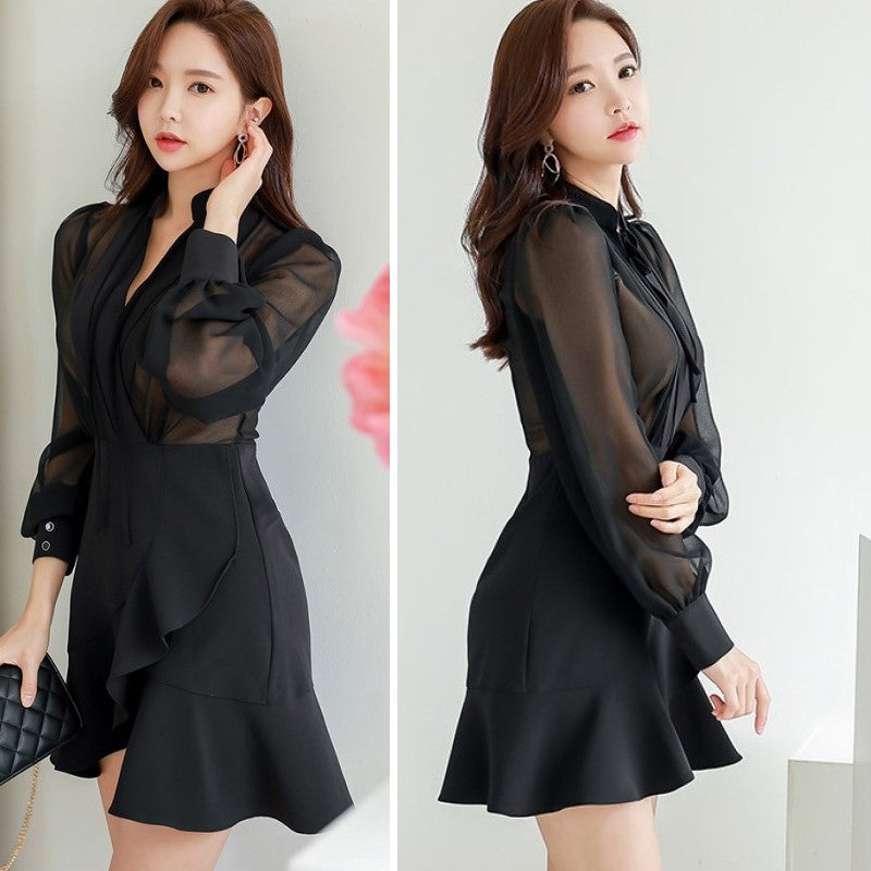 ミニ丈のフリルスカートがフェミニンで、シアーの透け感がイマドキなワンピース、ドレス