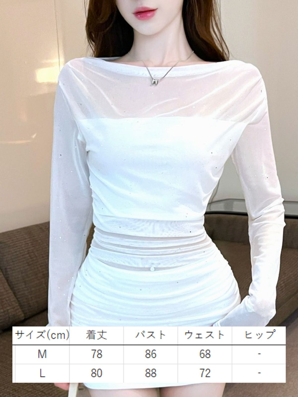 軽やかなストレッチメッシュに微細なラメドットを散らした、アシンメトリーなワンショルダー×オフショルダー構造のミニワンピース。身頃は全面シャーリングでフィットをコントロールし、袖は手の甲にかかるロングスリーブ。腰からヒップにかけてのドレープが縦ラインを強調し、ミニ丈ながら上品な印象をあたえます。