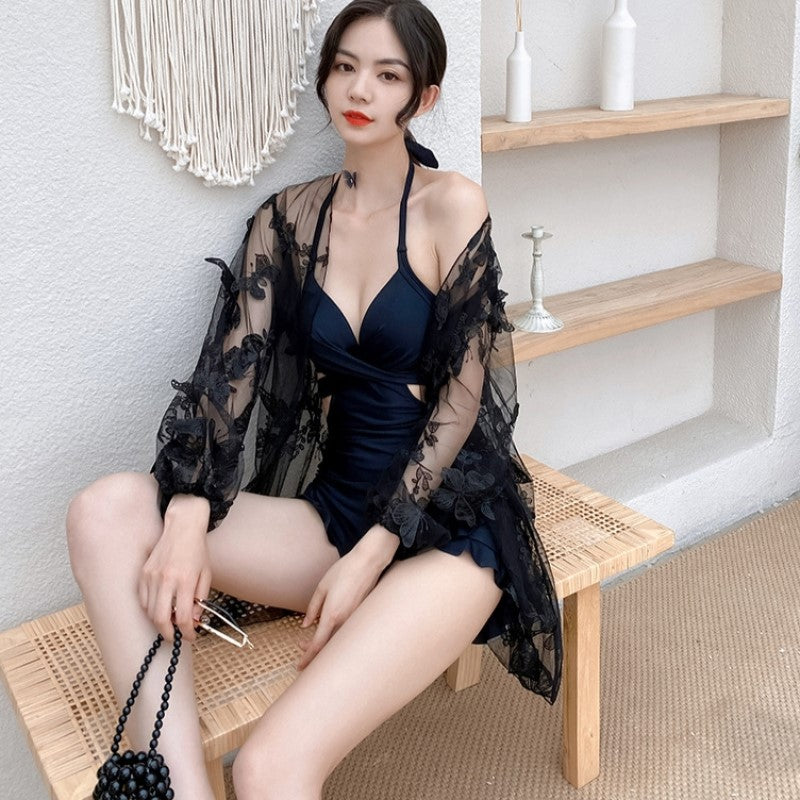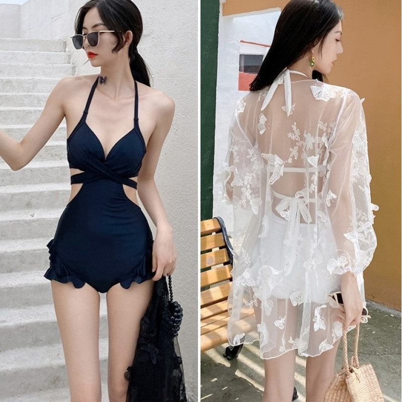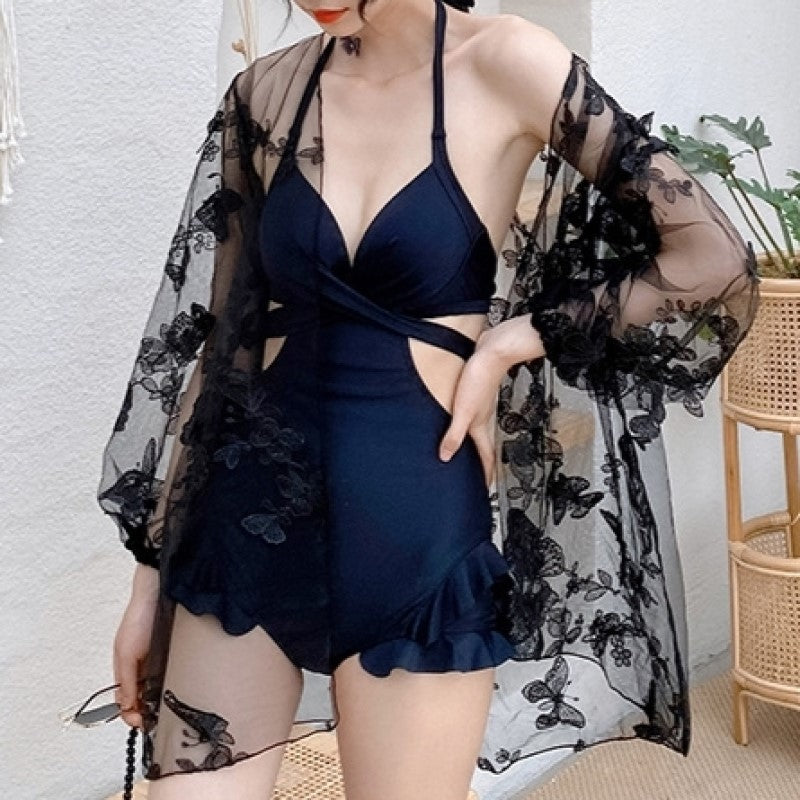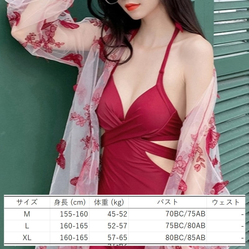蝶の刺繍が夢かわいい透けるオーバーウェアに一目ぼれ。胸元のクロスデザインや裾のフリルがキュートなモノキニタイプの水着です。